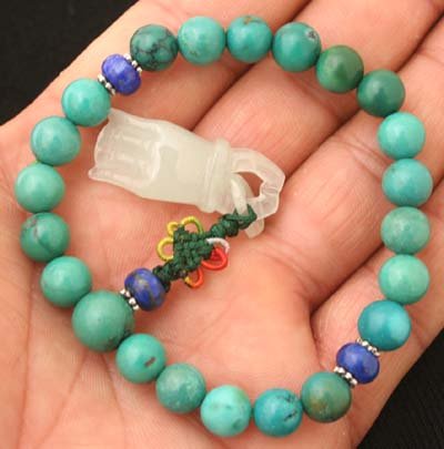 Beautiful 21 Beads Turquoise Stone Wrist Mala. Beads Measures Approximately 8mm. Wrist Mala has 2 Extra Lapis Marker Beads, Silver Spacers, matching Guru Bead and Decorated Tassel with Jade Blessing Hand. Note: All our Gemstone Wrist Malas are well strung on extra strong Elastic with Love and Prayers.