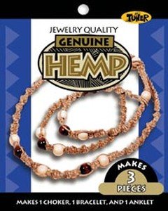 TONER-Hemp Jewelry Kit. This hemp kit makes three pieces: a choker; bracelet and an anklet. This package contains hemp; beads and detailed instructions. Available in a variety of styles: shape; size; color and number of beads vary by design. Contents may vary. WARNING: Choking Hazard-small parts. Not for children under 3 years. Made in USA.